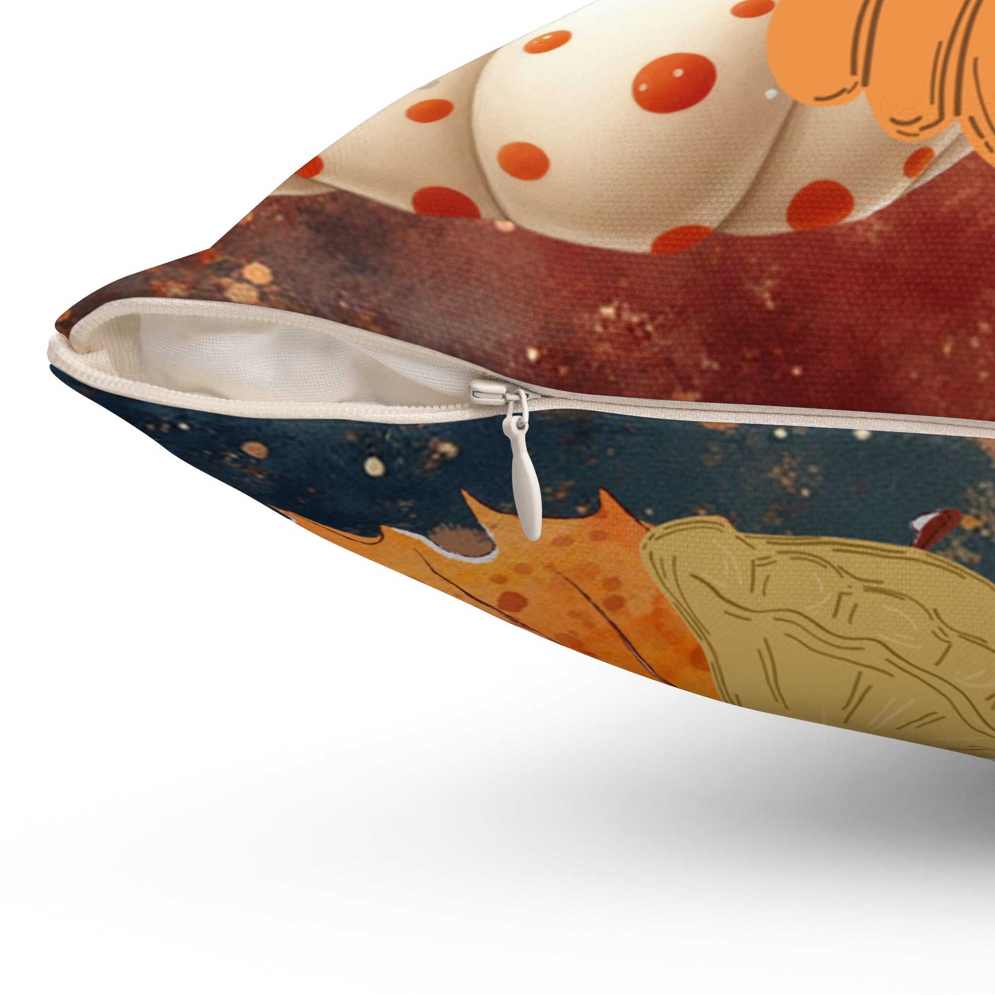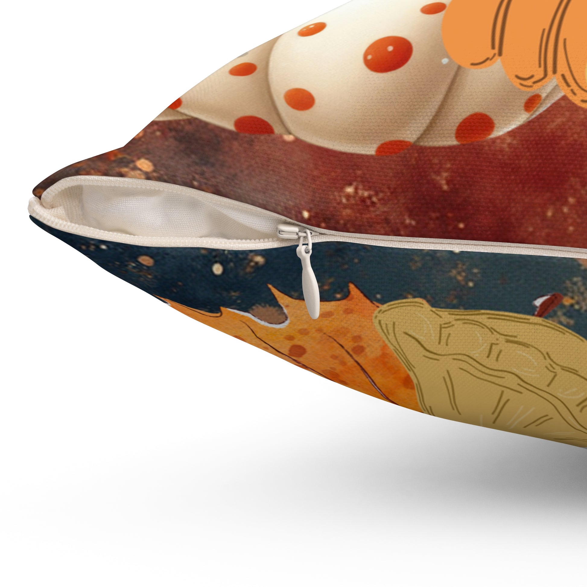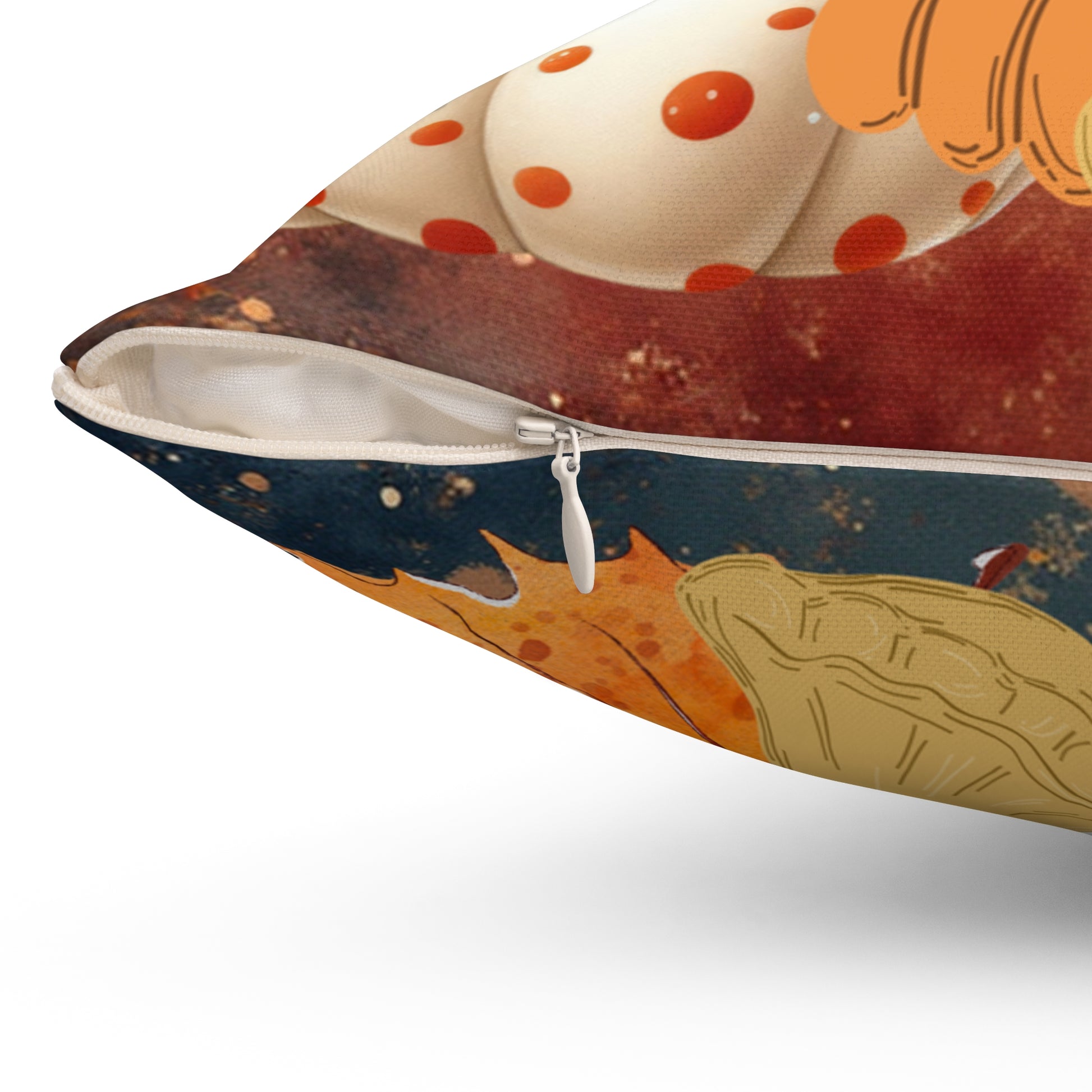 A cozy, double-sided throw pillow that brings autumn warmth to any room. Illustrated pumpkins, scattered leaves, and soft harvest tones create a gentle, nostalgic scene—playful polka-dotted gourds on one side and a moody, painterly vignette on the other. The spun-polyester cover keeps colors vivid and resists wrinkles, while the recycled polyester insert ships compressed so you can fluff it to a fuller, plush shape at home. Tuck it into a reading nook, layer it on a sofa with neutral blankets, or set it on a kitchen bench to deepen the season’s atmosphere.