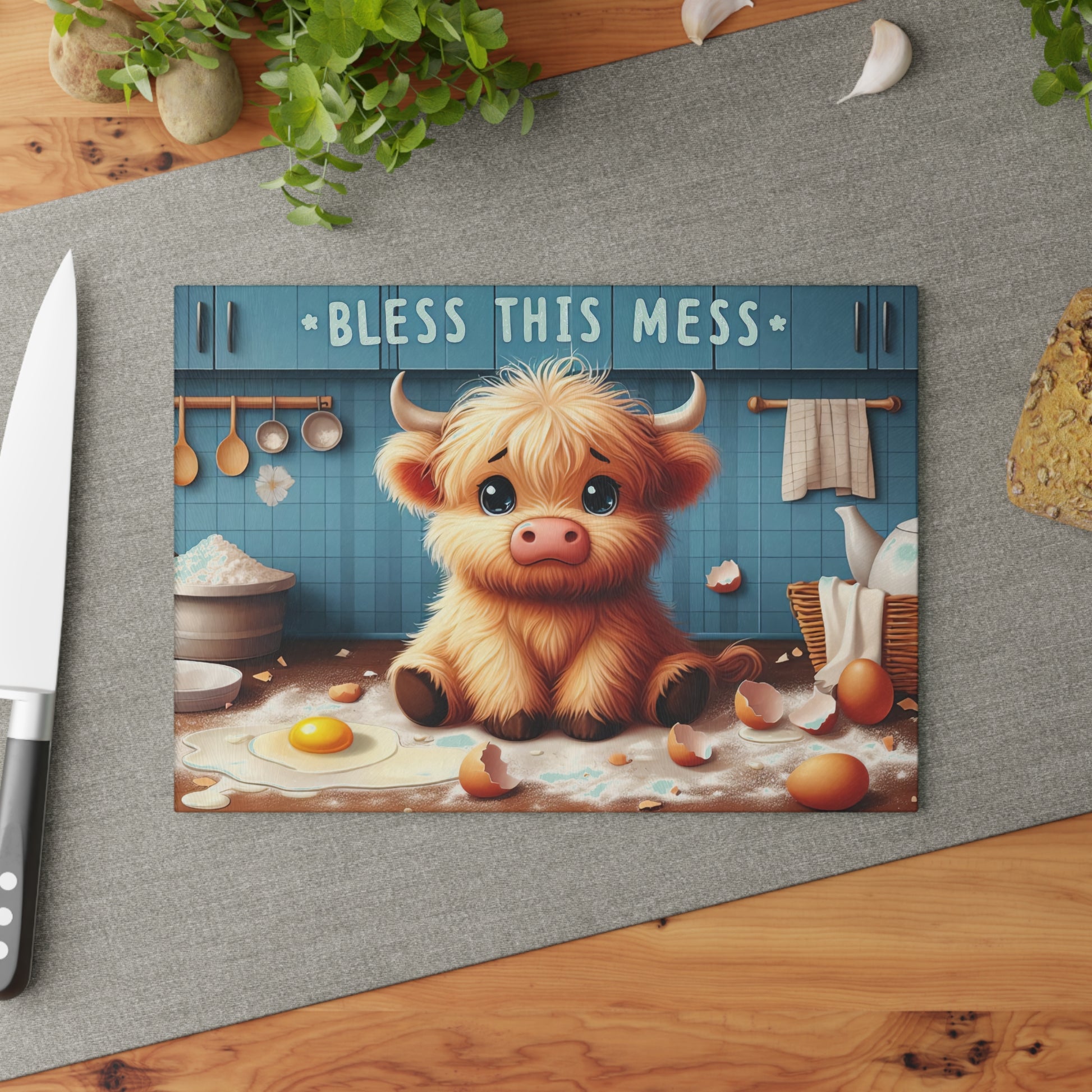 A cheerful tempered glass cutting board that brings warmth and whimsy to everyday kitchen moments. The design features a fluffy Highland calf surrounded by baking flour and cracked eggs, under the banner “Bless This Mess,” rendered in bright, durable colors that resist scratching. Smooth, textured glass provides a sanitary prep surface while four rubber feet keep the board steady on counters. It works as a hardworking prep surface or a charming display piece when not in use. Hand wash recommended to preserve the vivid print and finish.
