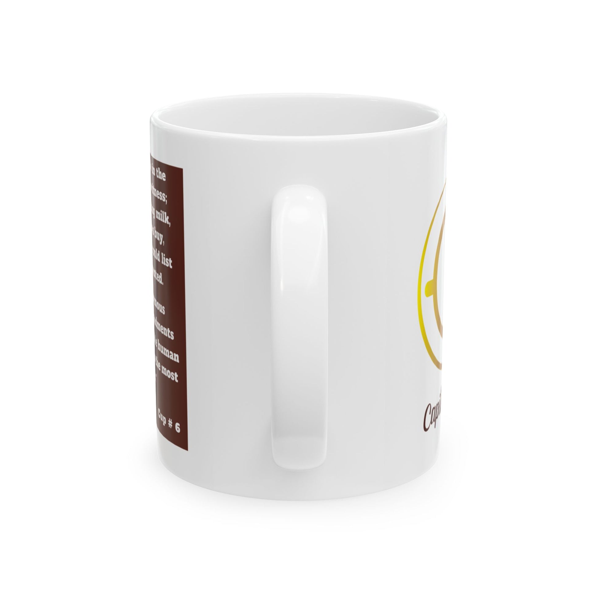 A warm, thoughtful ceramic mug that brings quiet moments into focus. The glossy white surface showcases crisp, vibrant print—clear text blocks and bold emblem—so every sip is wrapped in meaning. It feels steady in hand thanks to a comfortable C-handle, and the shiny finish catches morning light while the durable ceramic keeps the design vivid through daily use. Use it for coffee between meetings, tea during a reflective afternoon, or as the cup you reach for when you want a moment of clarity. The microwave- and dishwasher-safe construction gives practical freedom: heat your drink and clean up without worry. Lead- and BPA-free for everyday confidence.