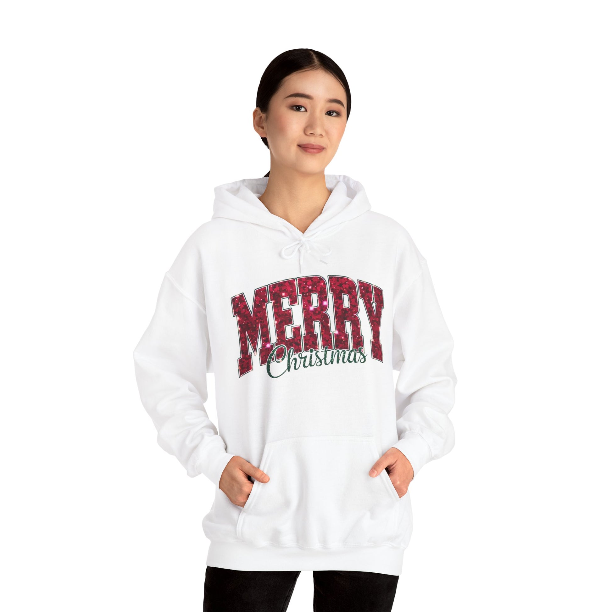Soft, warm, and quietly festive — this hooded sweatshirt wraps you in the calm joy of slow winter evenings. The front reads “MERRY” in a textured, plaid-like red with a delicate “Christmas” script beneath, giving the piece a familiar, homespun feel without shouting. The roomy kangaroo pocket and double-lined hood invite you to tuck your hands in and linger by a window watching snow or gather around a low-lit tree. It layers easily over flannel or a tee, becoming the go-to sweater for casual holiday gatherings, cozy nights by the fire, and morning walks with hot coffee.