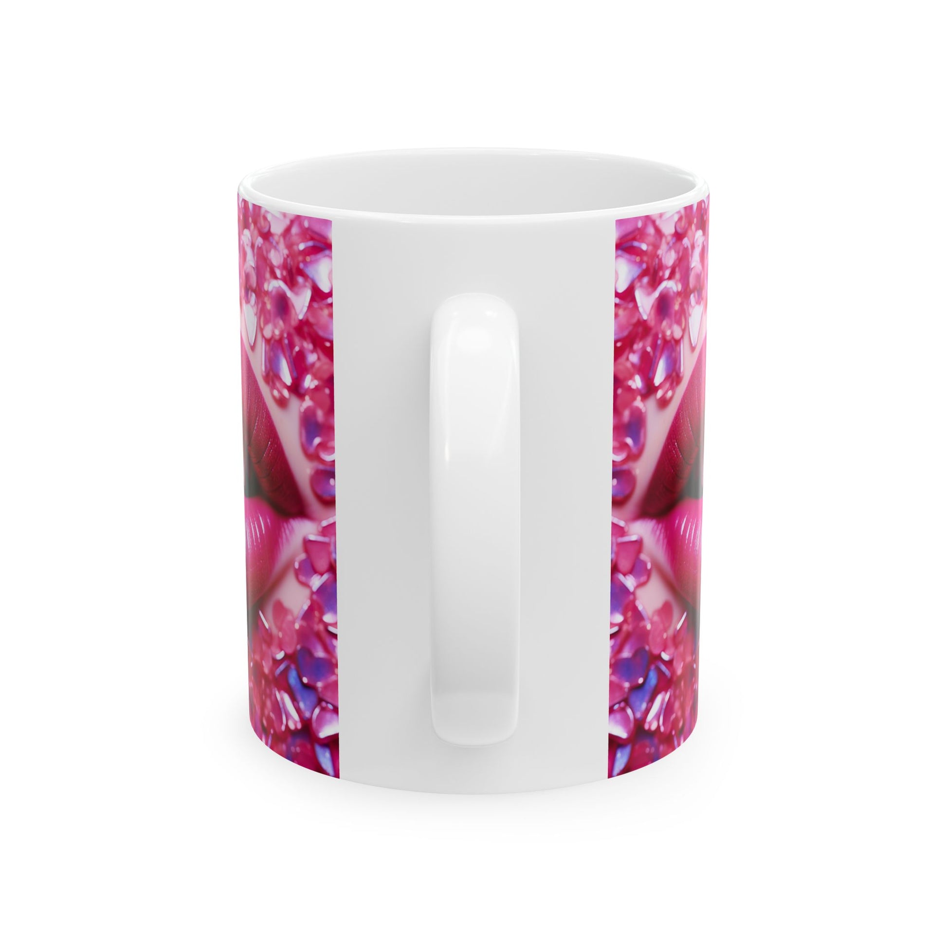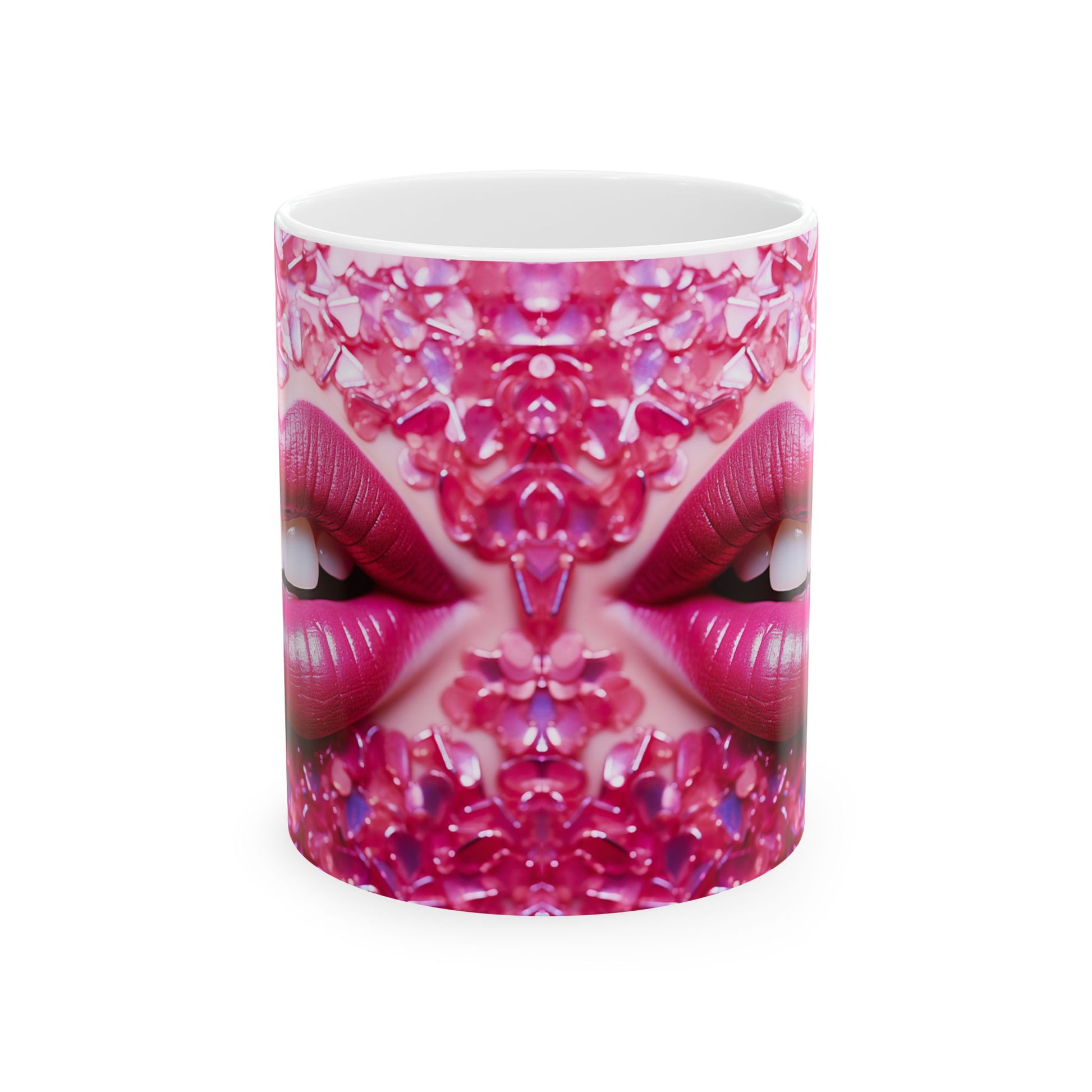 Sip from a mug that feels like wearable art. Glossy ceramic wraps a vibrant, kaleidoscopic lip motif in rich pinks and jewel tones — bright enough to spark a smile before your first sip. Hold it by the comfortable C-handle and feel the weight of quality: durable white ceramic, a shiny finish, and prints that stay vivid through daily use. Whether warming up on a slow morning or adding color to a cluttered desk, this mug brings playful glamour to everyday routines and cozy gatherings alike.