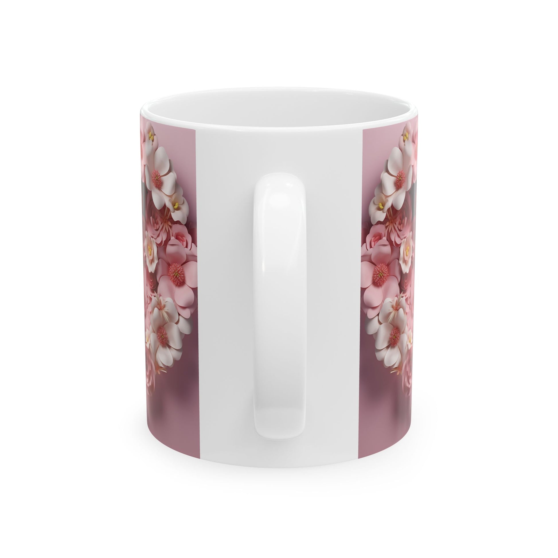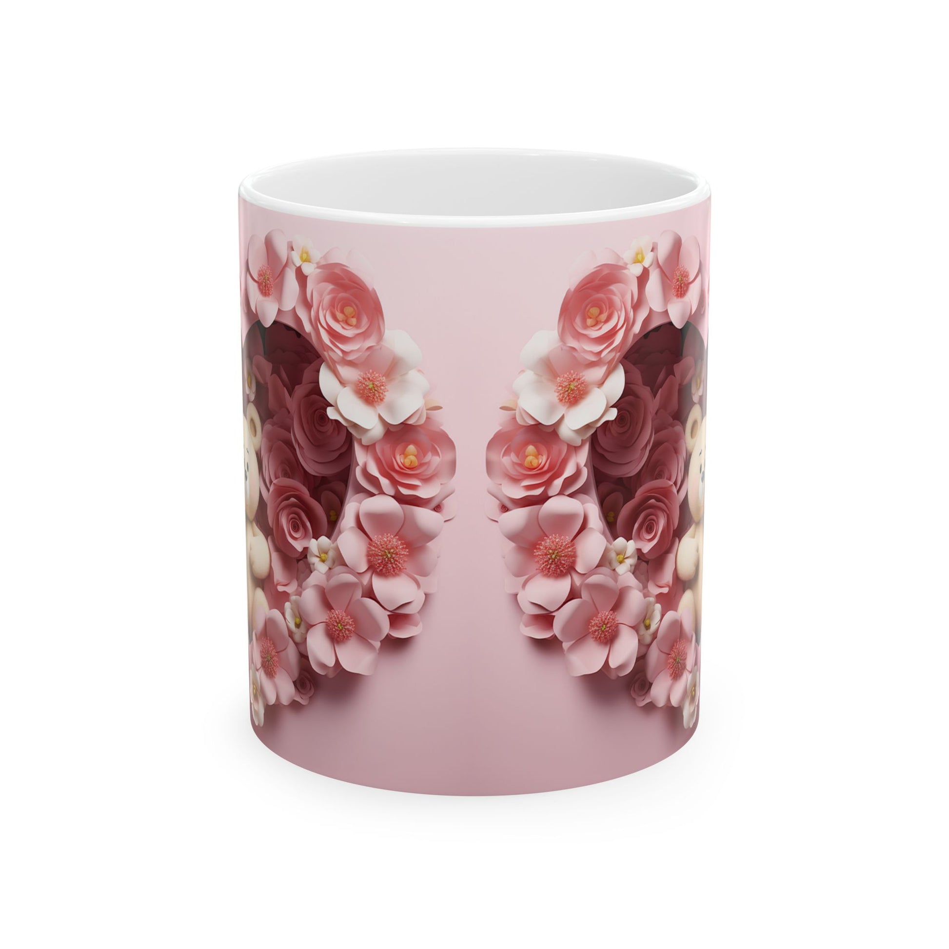 A glossy ceramic mug wrapped in a soft, romantic floral design. Blush pink background frames mirrored clusters of roses and delicate blooms, creating a gentle, feminine look that feels like a warm morning in a flower-filled garden. The comfortable C-handle and bright print make this mug a small daily ritual — sipping tea or coffee becomes a moment of calm and quiet beauty. Dishwasher- and microwave-safe, lead- and BPA-free, it’s built for everyday use while keeping the flowers vivid through many washes.