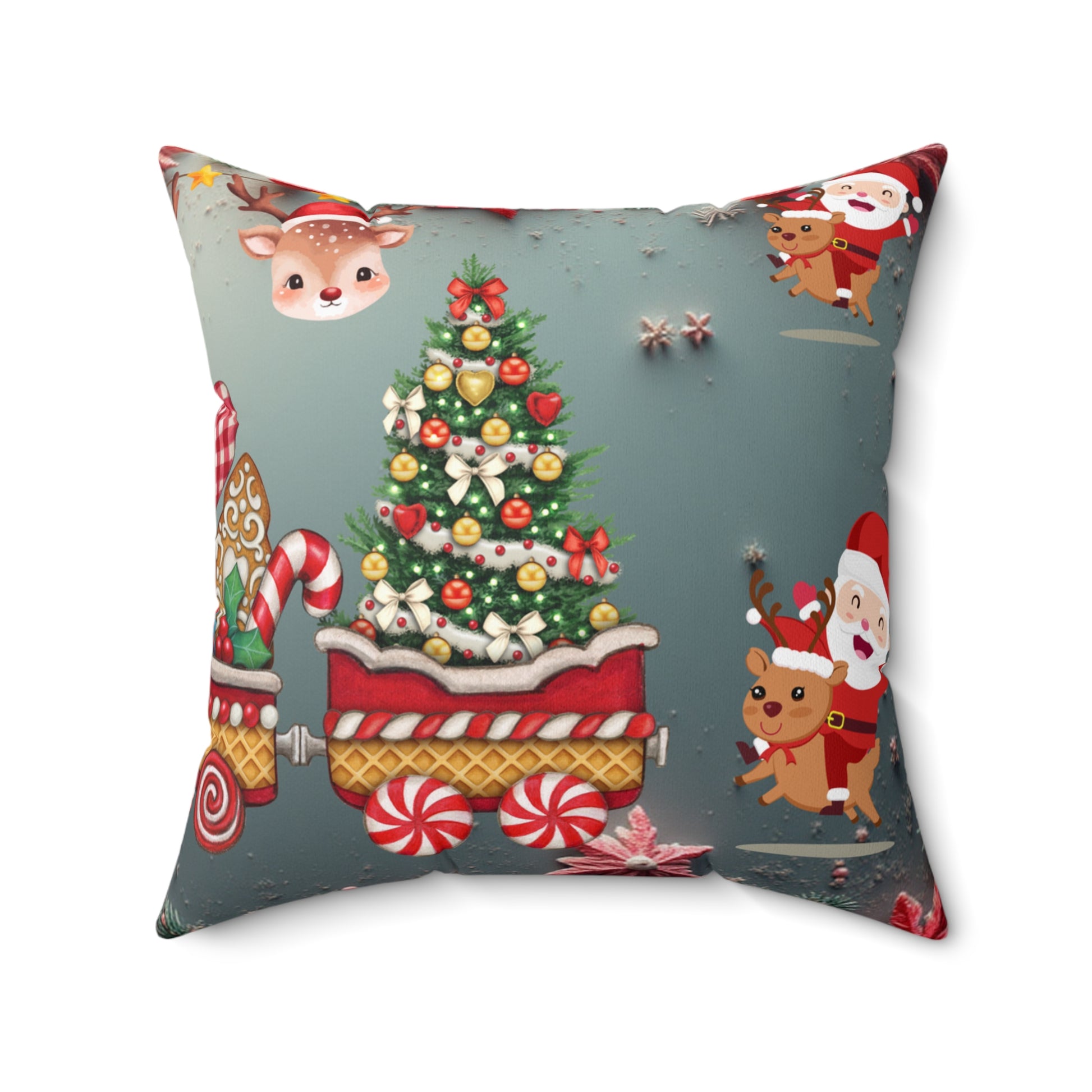 Soft, festive, and playfully nostalgic — this spun polyester square pillow brings holiday cheer to couches, reading nooks, and kids’ rooms. Double-sided printing shows cheerful Santas, reindeer, and a candy-train around a decorated tree, set against a muted wintery background that lets the colors pop without overwhelming a room. The cover stays smooth and wrinkle-free, with a concealed beige zipper that blends into the design. The recycled polyester insert ships vacuum-packed and is slightly oversized so the finished pillow looks full and pillowy once assembled. Tuck this cushion into a cozy corner to add a warm, handmade-feel accent that invites smiles and seasonal snuggles.