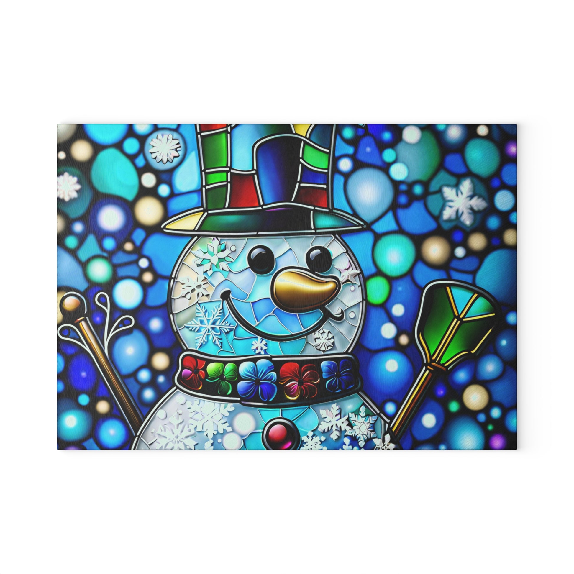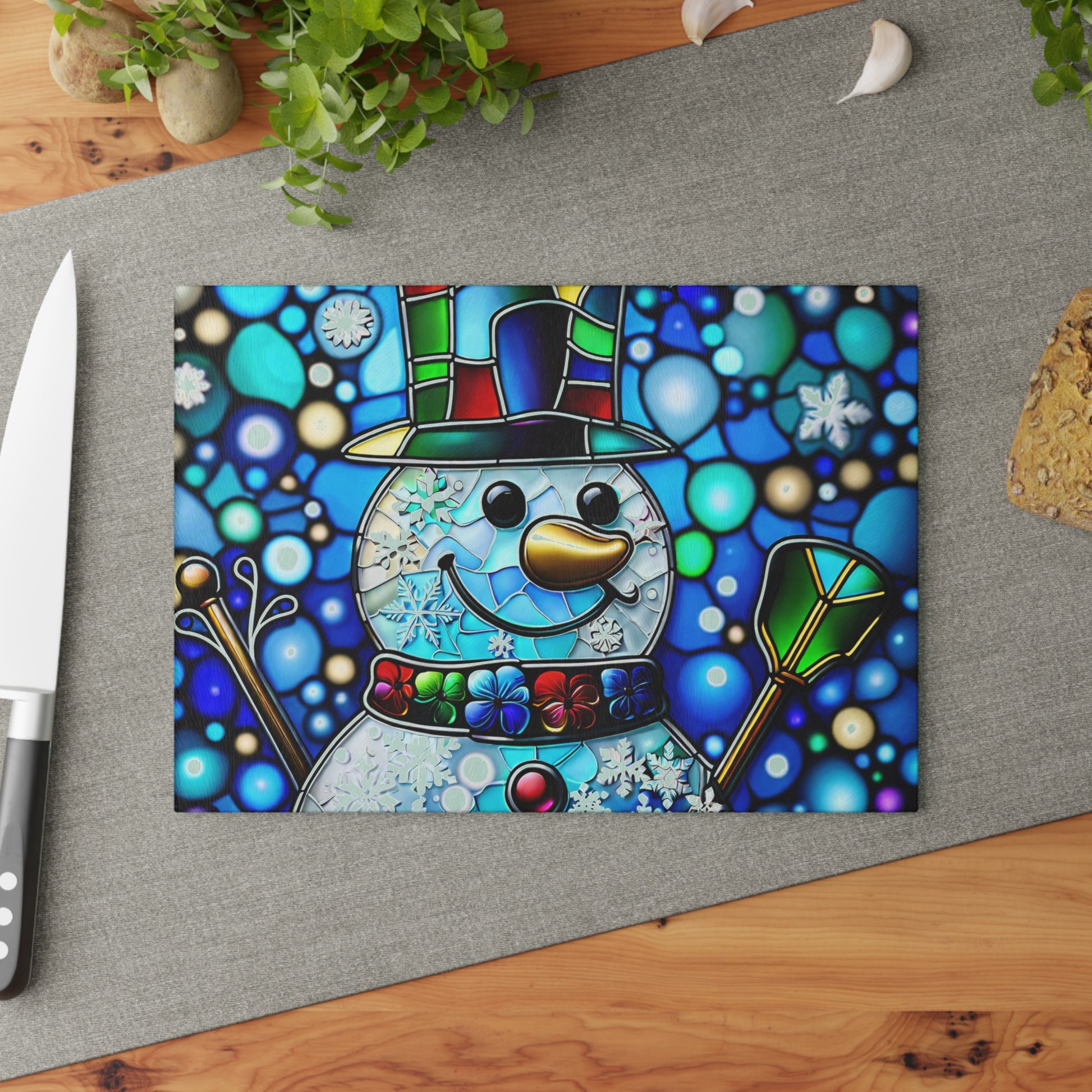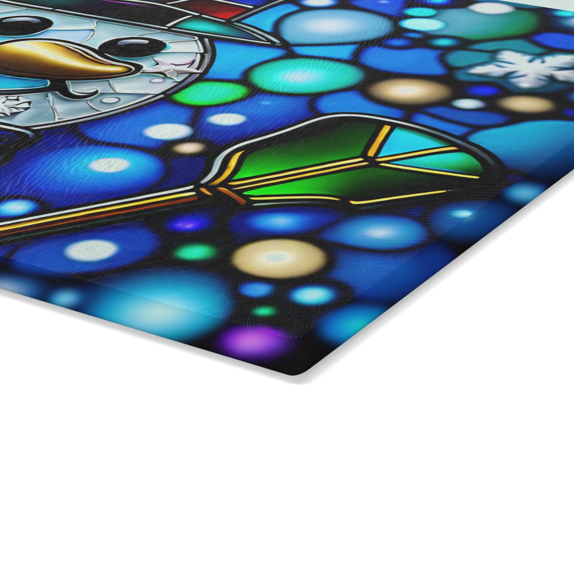 Bright, cheerful glass cutting board featuring a stained-glass–style snowman motif. The tempered glass surface showcases vivid, crisp colors and a textured finish that feels modern while remaining easy to clean. Four rubber feet keep the board steady on countertops while you prep, and the durable printing method protects the design from scratches during normal use. Offered in two convenient sizes, this board brings a playful winter scene to holiday kitchens and everyday meal prep with a sanitary, nonporous surface that resists staining and odors. Hand wash recommended to preserve the print and finish.
